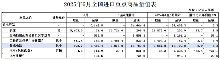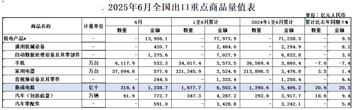 2025年上半年,我国出口集成电路6502.6亿元,增长20.3%;进口集成电路13752.5亿元,增长8.3%