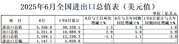 2025年上半年,我国进出口总值3.03万亿美元,增长1.8%。其中,出口1.81万亿美元,增长5.9%;进口1.22万亿美元,下降3.9%
